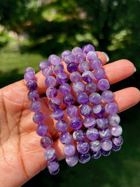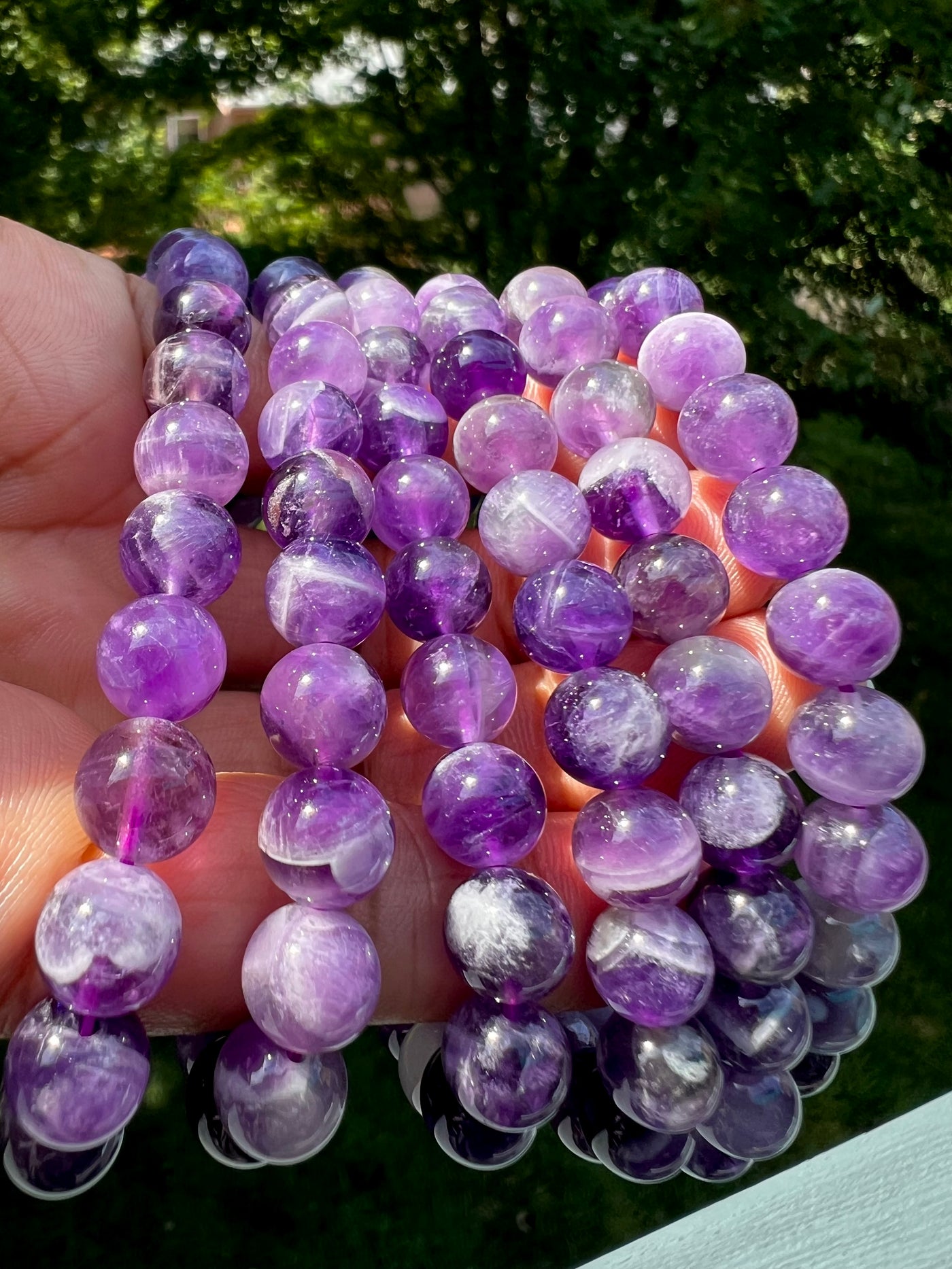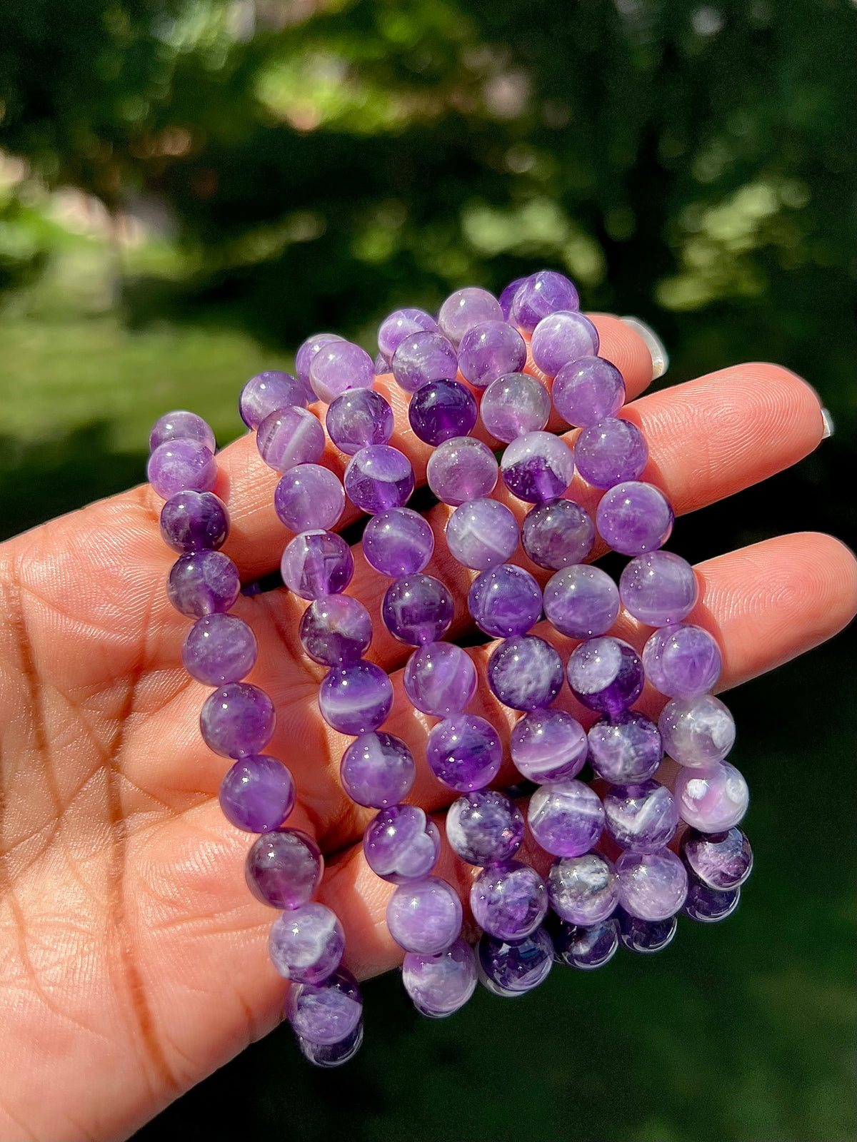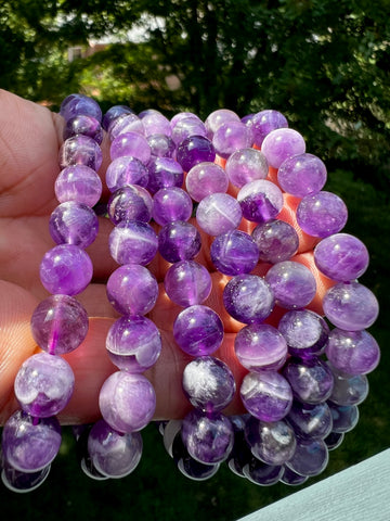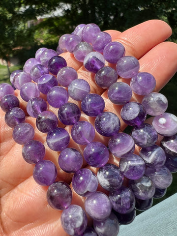 Dream amethyst is also known as chevron amethyst. It contains amethyst andΒ beautiful white quartz banding.