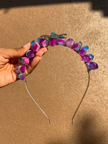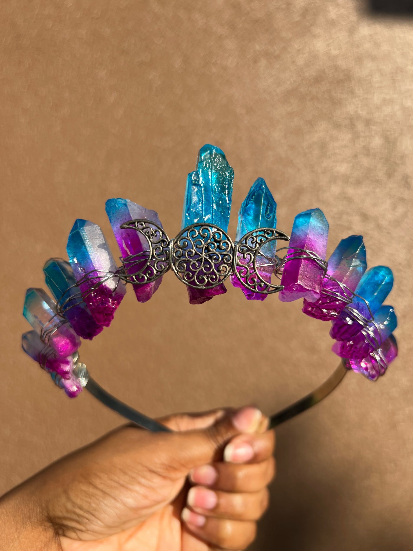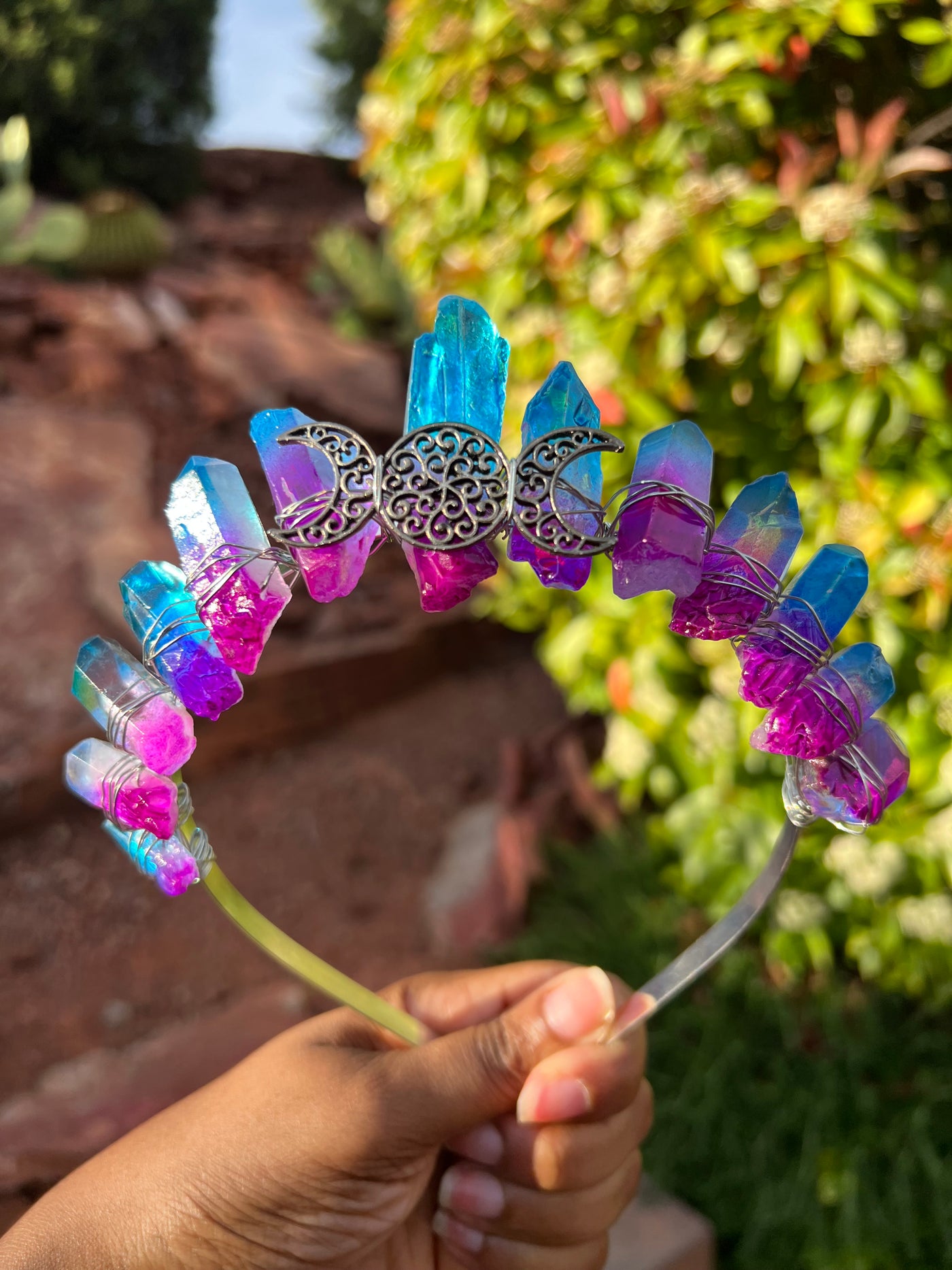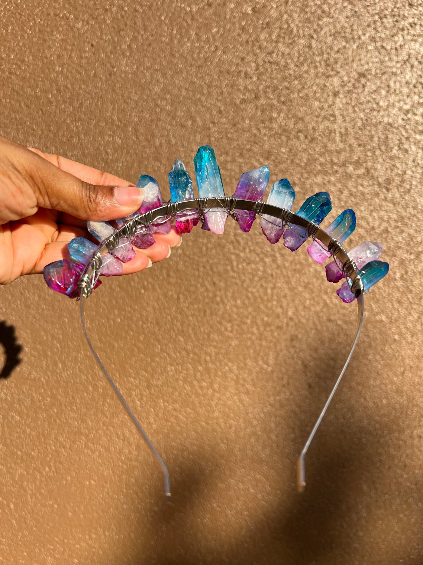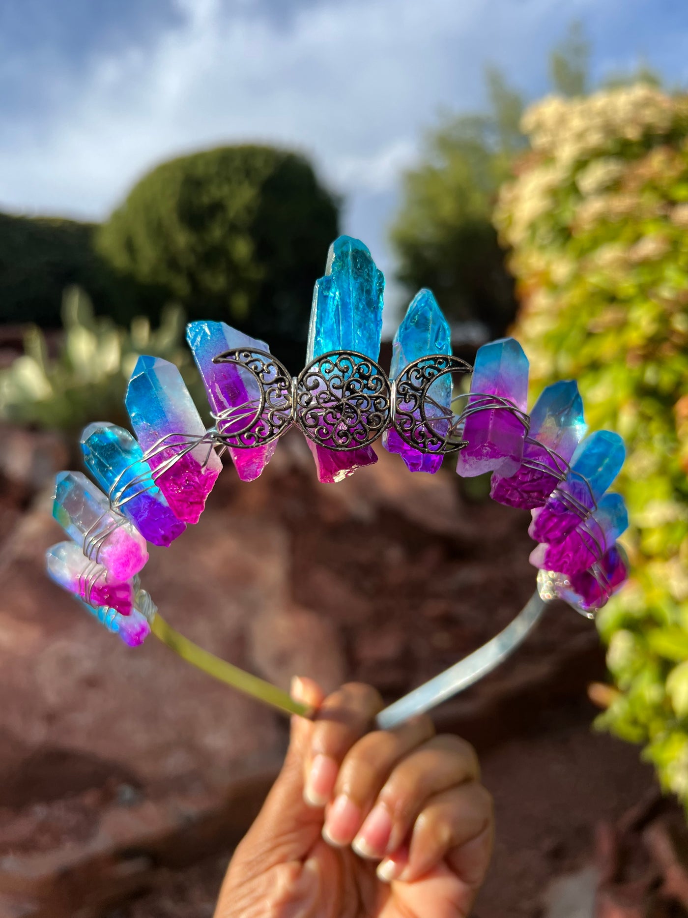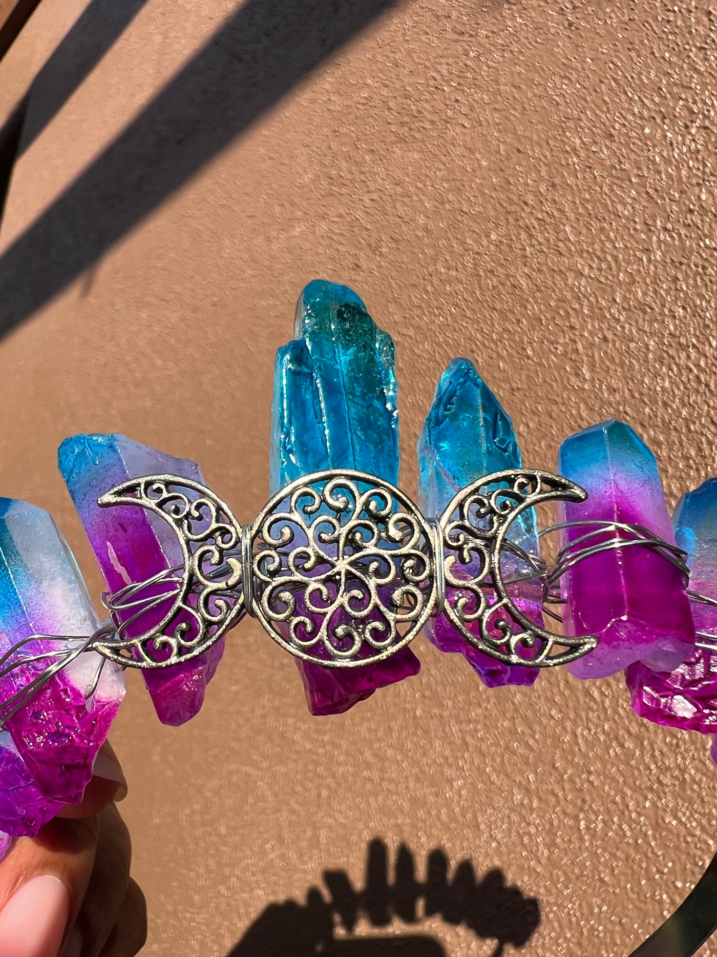 Natural quartz clusters treated with dye & metal coating create this colorful, iridescent gleam! (The quartz crystal is natural, the "aura" coating is not 🤍)